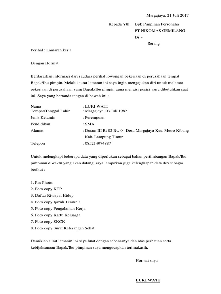 Jika kamu ingin melamar kerja secara praktis, gunakanlah alat elektronik yang sudah kamu miliki. Dianjurkan mengirimkan lamaran menggunakan pos. Kibin, serang, po box 7171 telepon (0254) 401586. Saya bermaksud mengajukan lamaran kerja pada pt. Alamat pt nikomas gemilang divisi nike.